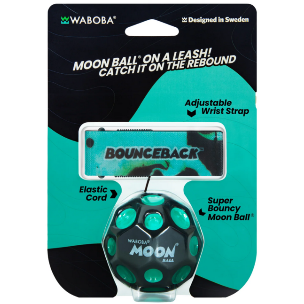- The Waboba® Bounceback™ Moon Ball® features an adjustable Velcro® wristband and a 47-inch elastic cord.