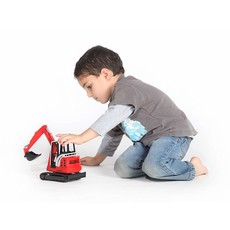 The excavator arm on the BRUDER® Schaeff HR16 Mini Excavator is fully functioning, the bucket can be detached and the plough blade is adjustable. The jib crane can be articulated laterally, making a realistic excavator function possible. Also, the driver's cab of the Schaeff mini excavator turns 360 degrees, and the rubber tracks ensure a quiet rolling motion.