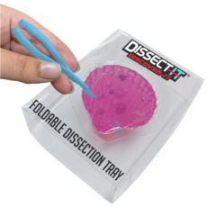 Each kit includes a gel specimen, learning guide, foldable dissection table, and 2-in-1 scalpel and tweezer tool to help with the dissection process. A detailed, 8-page, fold-out learning guide walks users through the dissection process. The guide also provides tons of information about the specimen being dissected and the surprises that come inside!