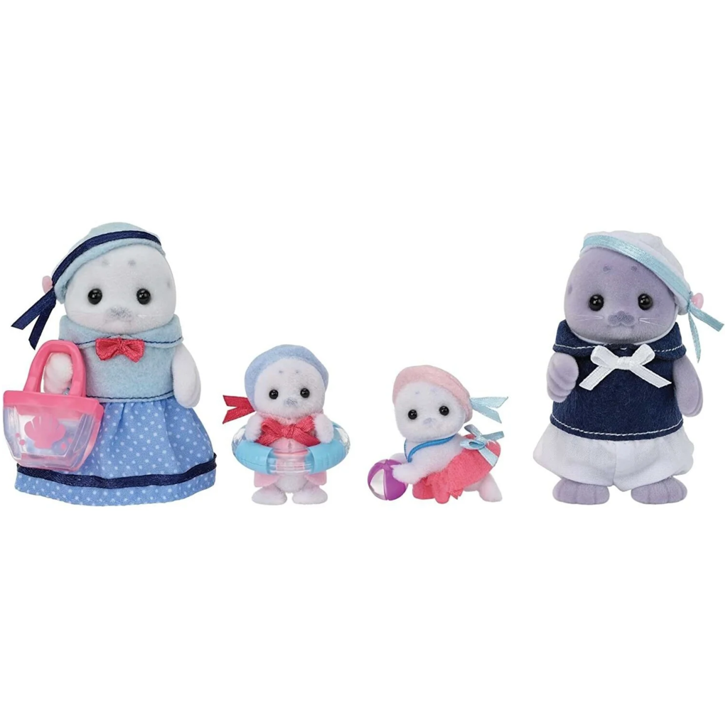 The Calico Critters® Seal Family are a round and adorable family with features like eyebrow-like patterns, ear depressions, and whiskers around the mouth. The set includes father Maurice, mother Amora, brother Puffy and sister Muffy, dressed in adorable marine-themed outfits, along with pool accessories. The babies have a special soft and fluffy texture!