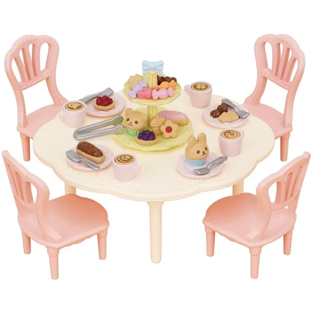 - The Calico Critters® Sweets Party Set by EPOCH Everlasting Play is a furniture set featuring a colorful table and chairs with coffee, cakes and other sweet treats.